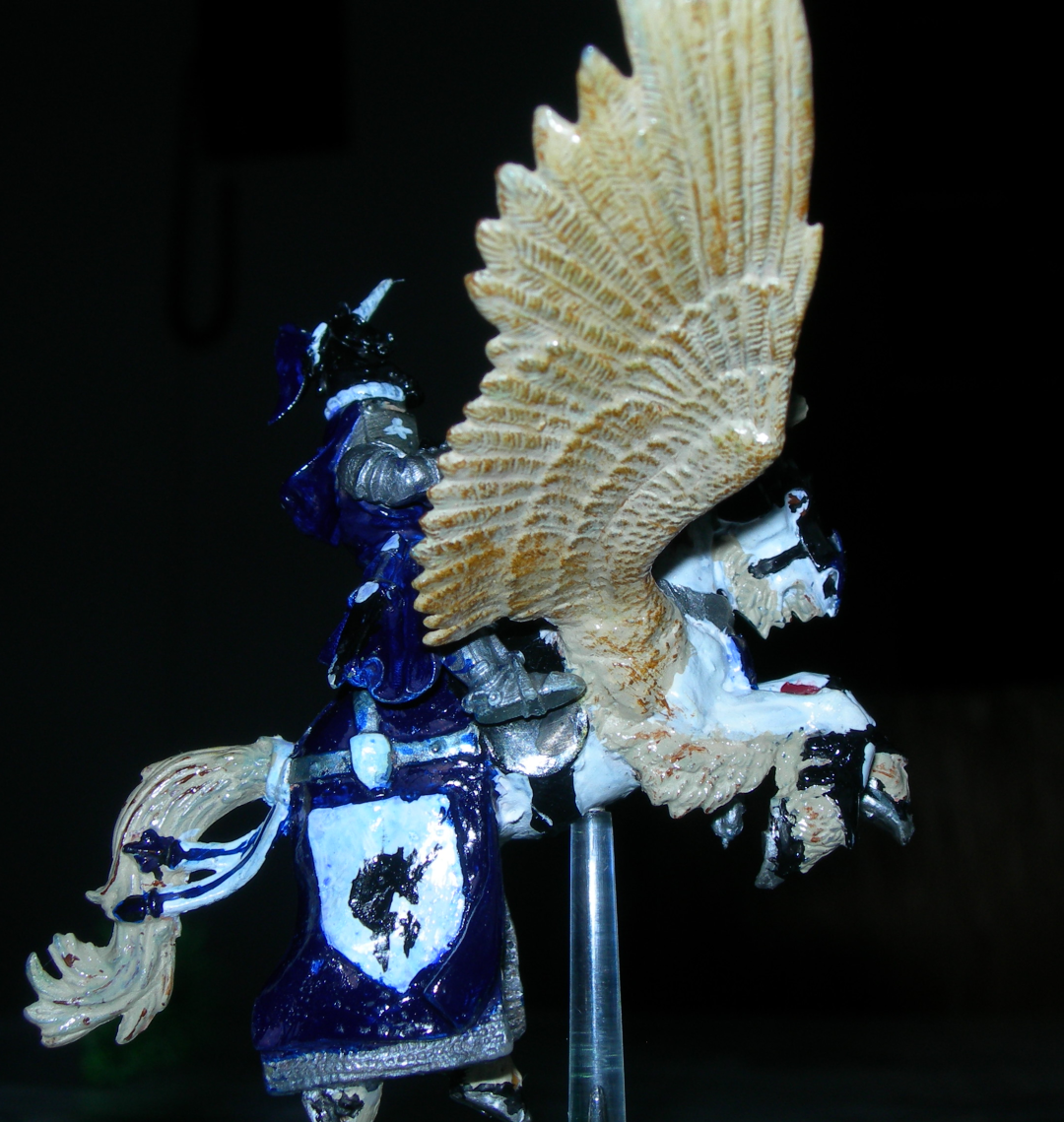 I didn’t know much about painting and photographing when I started. A lot of my early models are now stripped and either stored away or repainted. I didn’t have a habit of taking pictures of them either, except for this pegasus. It was one of the first bigger minis I painted and I was quite proud of it then. A goopy layer of undiluted midnight blue, drybrushing on the wings with a darker colour and a freehand that, if you squint, looks a little like the unicorn on the knight’s helm.