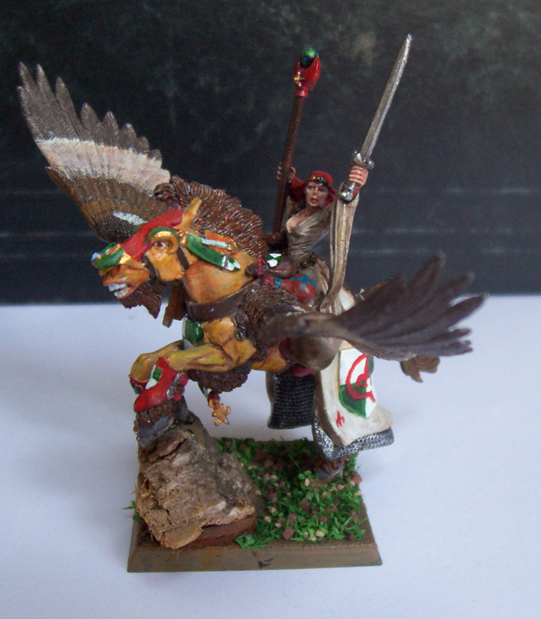 The pegasus on the right was done about four years later. I thinned my paint, worked with some layering and washing. The wings pop out with multiple colours. The freehanded lilies are recognizable as such. When I painted this, it was the best I could do. It was the summer before I started college and the summer I started my second army: Dark Elves.