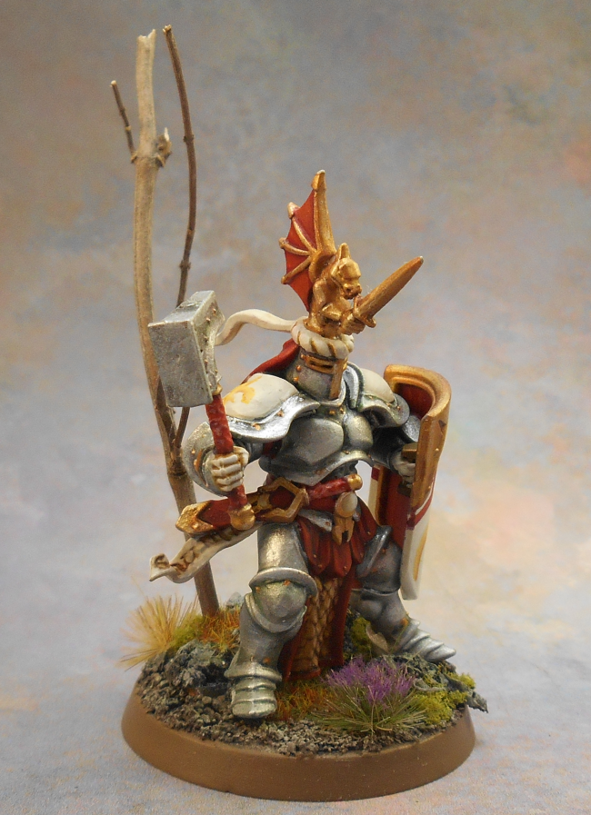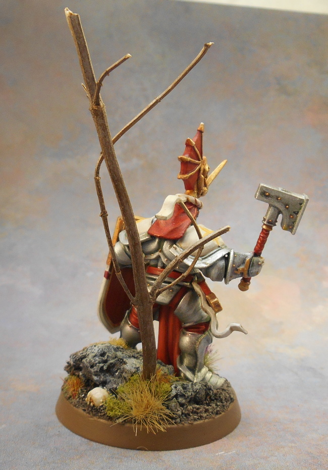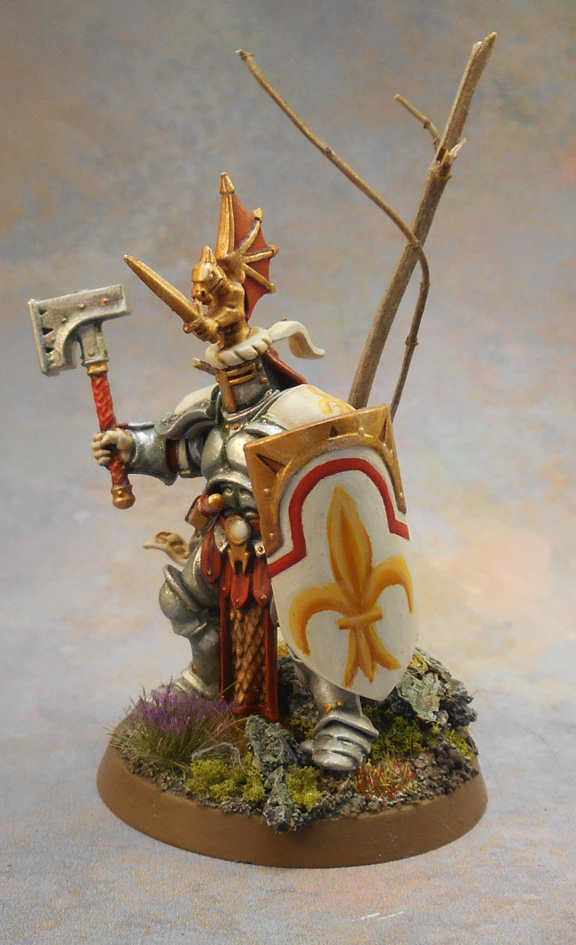 I kept the paintjob rather simple: I highlighted the armor by sponging, a bit of washing and some sponging again. To make the model stand out a bit I added a freehand fleur-de-lys on his shield. I think it also ties in the model nicely with Bretonnia in the World-that-Was. For his base, I used an actual dried twig to serve as a little tree!